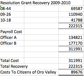 Here's an example, provided by our Guest View commenter, John Musolf, when grants for Police Officers actually cost the town almost $90,000! It relates to two police officers assigned during a two year period (2009 and 2010) to the Pima County/Tucson Metropolitan Counter Narcotic Alliance (CNA):